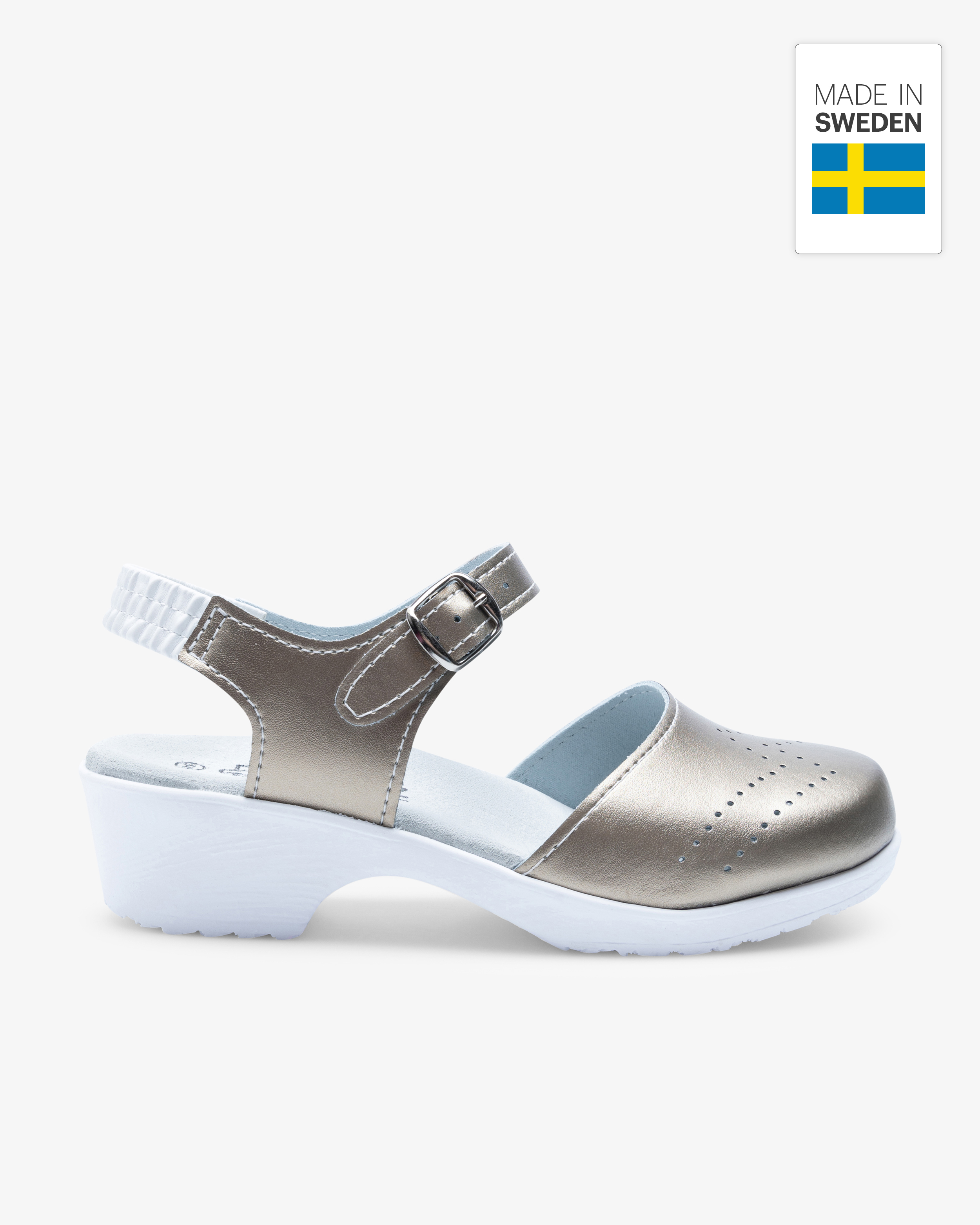 Stilvoll und bequem: der Beez Zeitloser Clog mit Holzsohle in Champagner/Metallic. Dieser Schuh wird in Schweden handgefertigt. Das Obermaterial aus echtem Leder hat eine schützende PU-Beschichtung mit Metallic-Glanz, die leicht zu reinigen ist. Die weiche PU-Sohle und die stützende Einlage aus Holzfurnier machen ihn ideal für lange Arbeitstage. Atmungsaktiv und mit harter Zehenkappe.