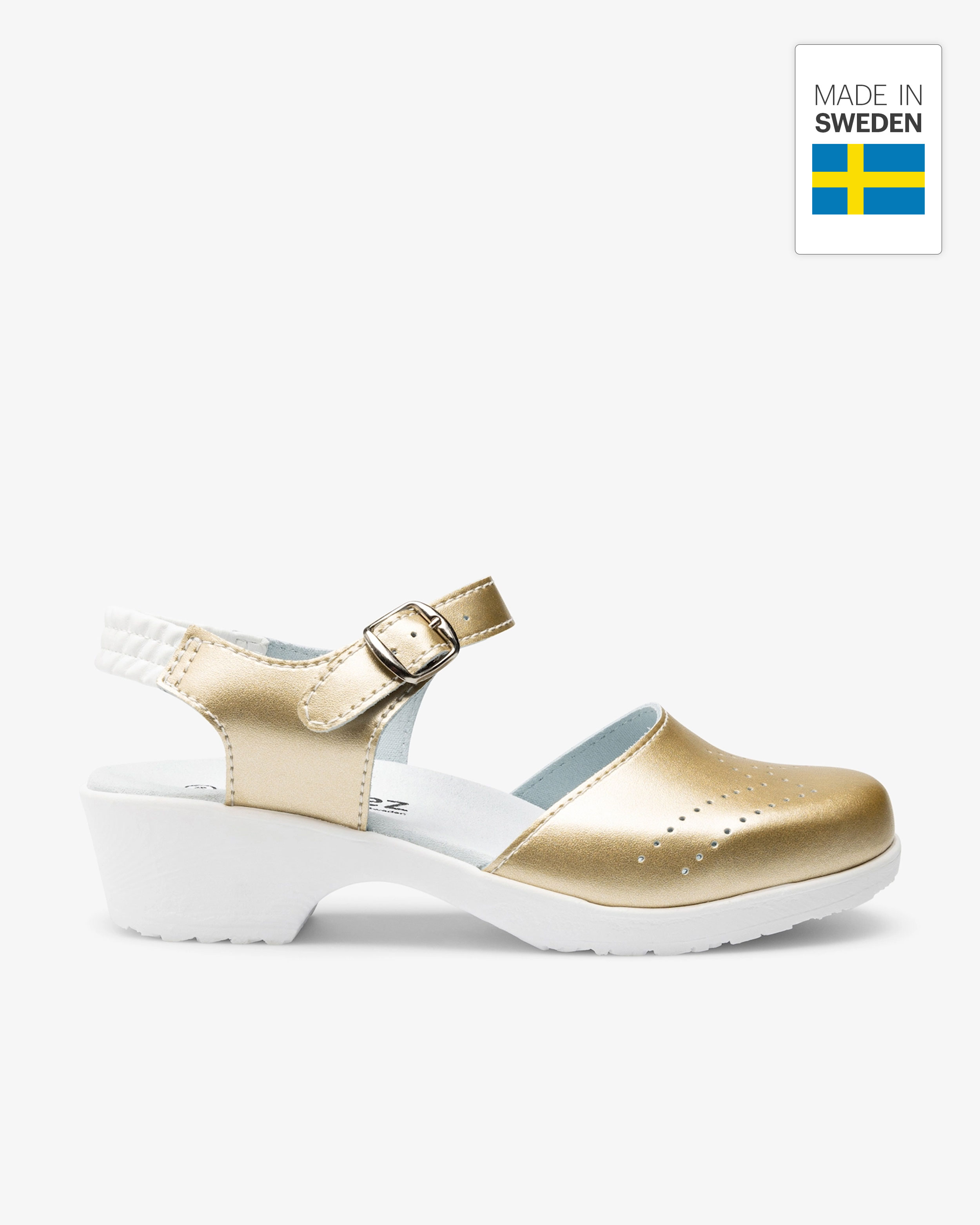 Die Arbeitsschuhe von Color4care werden in Schweden handgefertigt und sind für den medizinischen Bereich entworfen. Das Obermaterial aus echtem Leder ist mit einer schützenden Schicht aus mattem PU in Gold überzogen, was eine einfache Reinigung ermöglicht. Die weiche, langlebige PU-Sohle mit Kalbsvelours-Einlage sorgt für Komfort. Der Schuh ist atmungsaktiv und bietet Schutz durch eine harte Kappe. Perfekt für alle, die viel stehen und gehen.