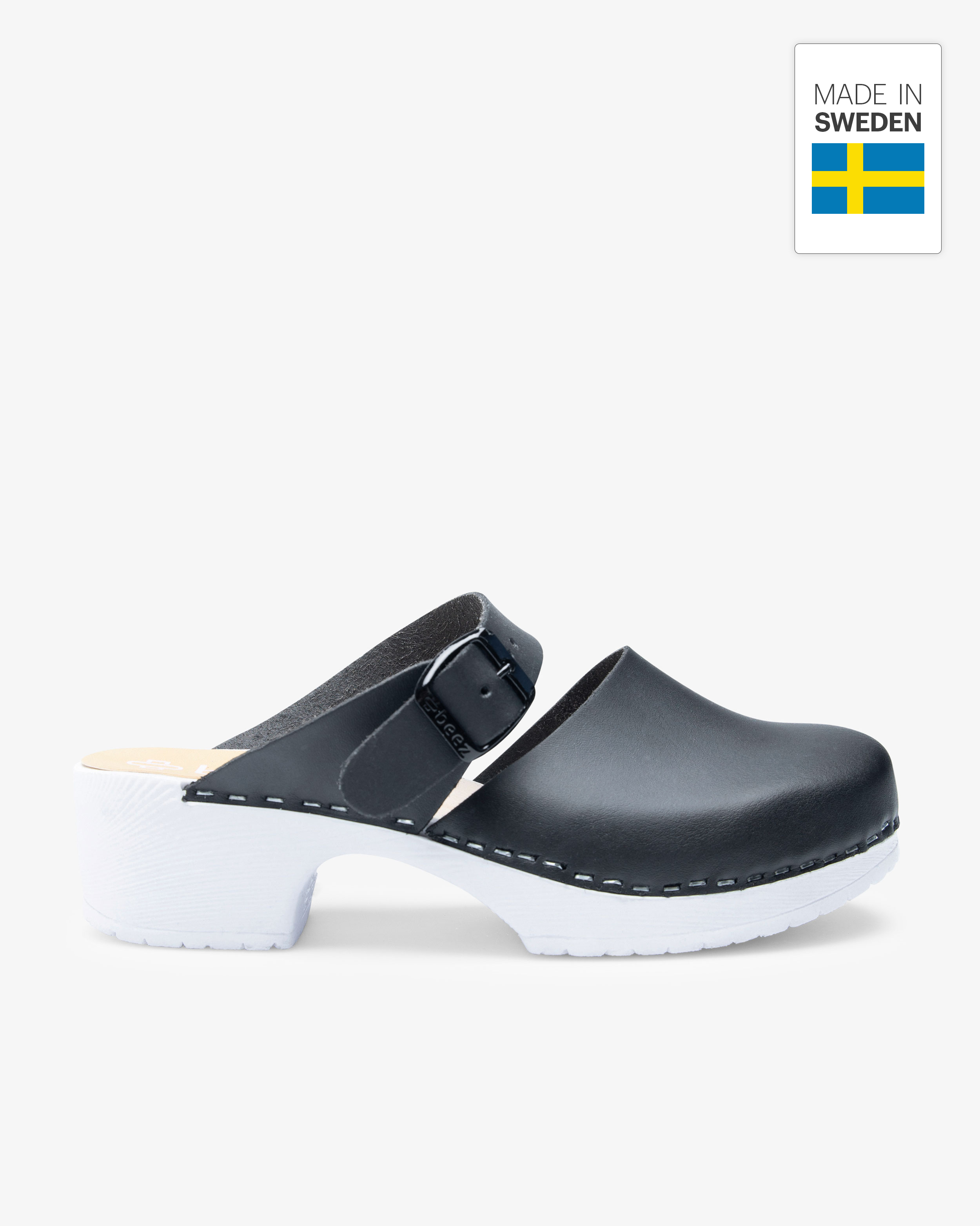 Der Beez Belle Slip-on Clog mit Holzsohle in Schwarz Vegan. Ein Slip-in-Arbeitsschuh im Damenmodell, der optimalen Komfort für lange Arbeitstage bietet. Die Sohle aus PU-Gummi dämpft Stöße und bietet guten Halt, ergänzt durch eine stabilisierende Holzfurnier-Einlage. Der verstellbare Riemen ermöglicht eine individuelle Passform. Das 100% vegane Obermaterial ist leicht zu reinigen und die harte Zehenkappe schützt.
