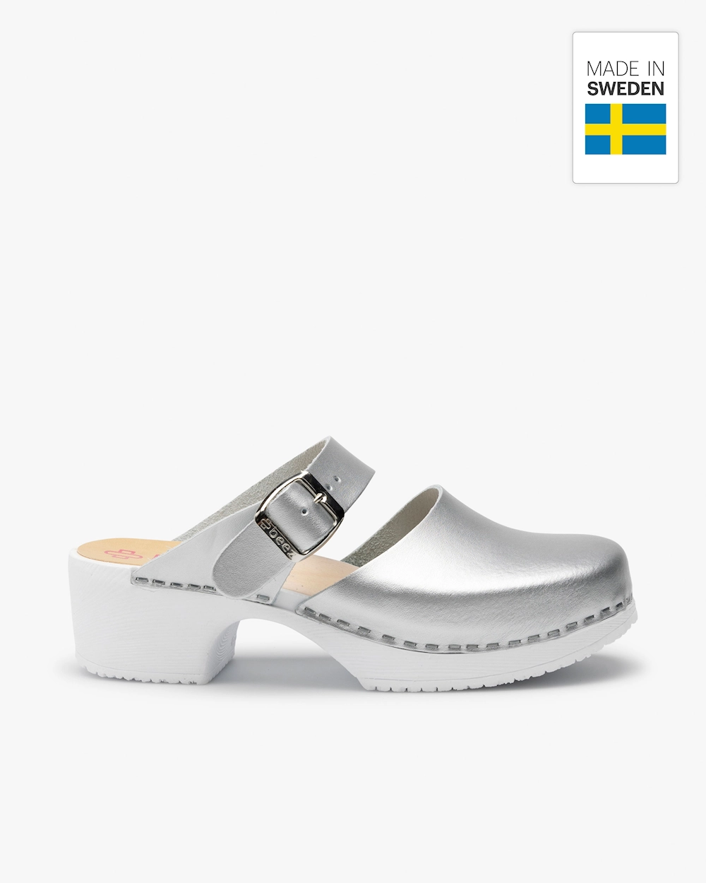 Entdecken Sie den Beez Belle Clog in Silber/Metallic, einen trendigen Arbeitsschuh mit schickem Design. Er kombiniert den Look eines klassischen Clogs mit modernen Features wie einer verstellbaren Schnalle und luftigen Ausschnitten. Die stabile PU-Gummisohle sorgt für guten Halt, während die Holzfurniereinlage bei langen Schichten stützt. Das pflegeleichte PU-Obermaterial ist ideal für den Pflegebereich.