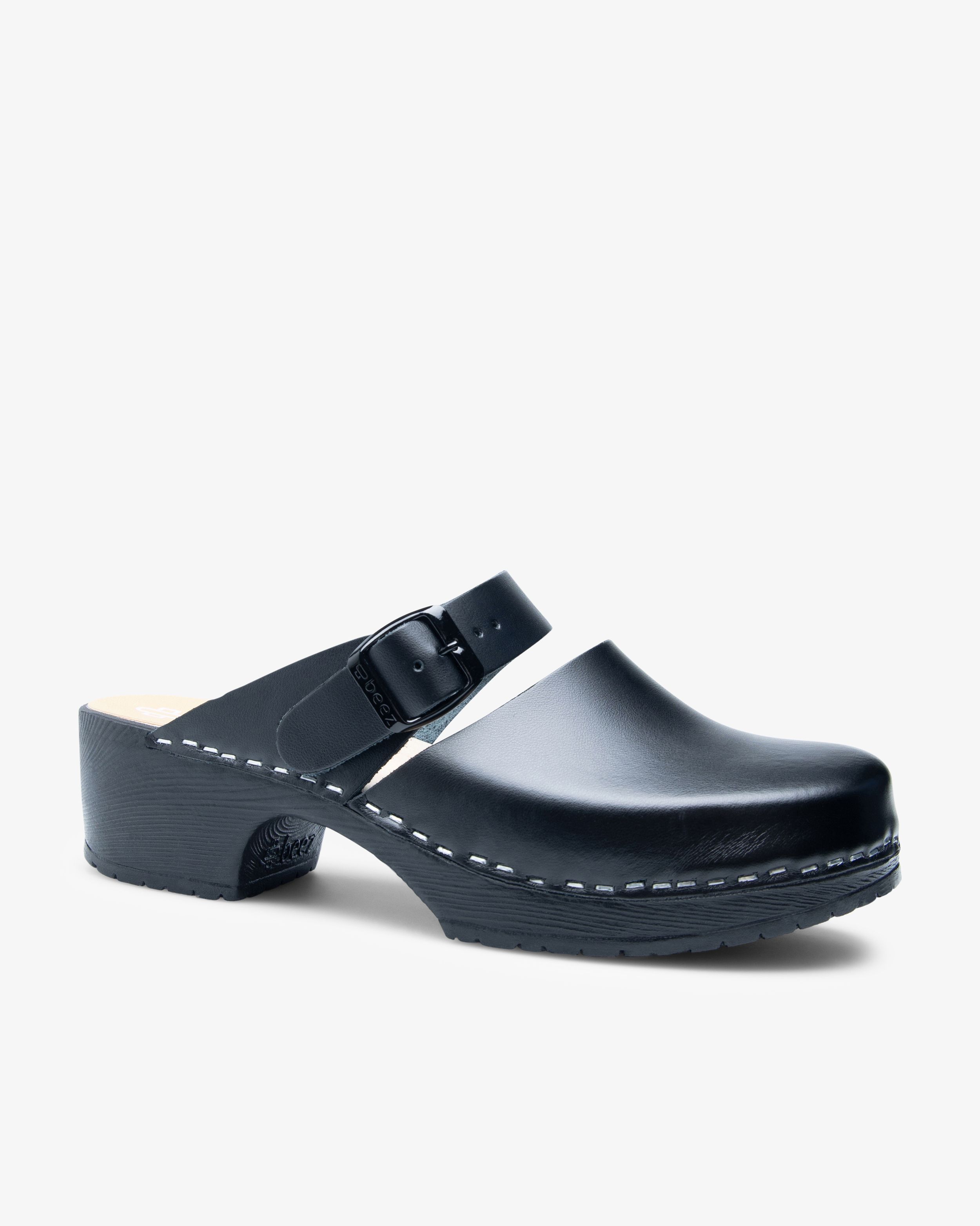 Der Beez Belle Slip-on Clog mit Holzsohle in Schwarz. Die Arbeitsschuhe von Vårdväskan werden von Hand in Schweden gefertigt und sind für den Pflegeberuf konzipiert. Das Obermaterial besteht aus echtem Leder mit einer schützenden Schicht aus mattem PU. Diese Beschichtung ermöglicht eine einfache Reinigung mit milder Seife und Wasser. Der Riemen hat eine nickelfreie Schnalle und ist verstellbar. Die Sohle besteht aus weichem, strapazierfähigem PU (Polyurethan) und hat eine stützende Einlage aus Holzfurnier. Der Schuh ist atmungsaktiv und hat eine harte Zehenkappe. Perfekt für lange Tage auf harten Böden.