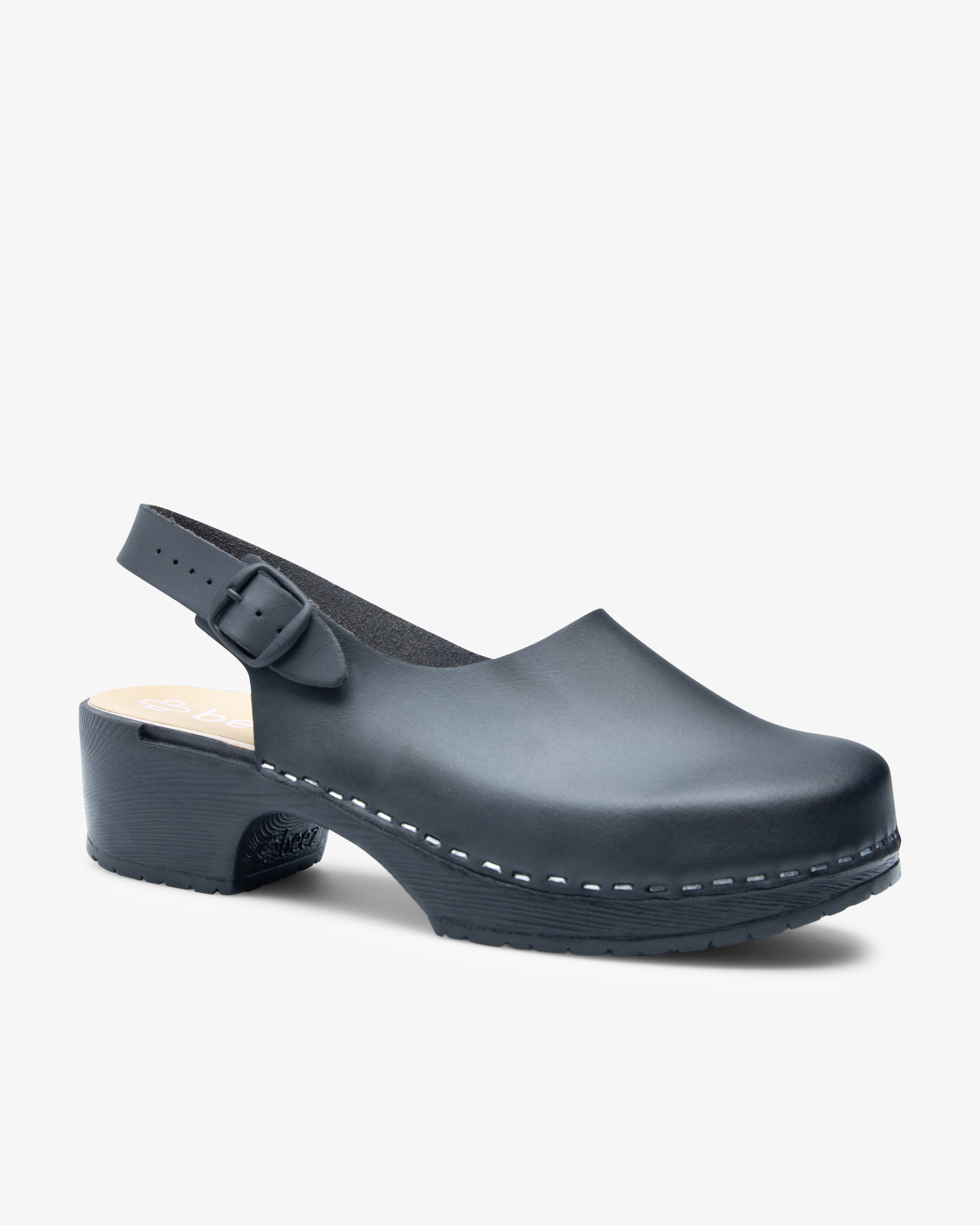 Der Beez Modeste Clog mit Holzsohle in Schwarz Vegan ist ein Arbeitsschuh für Damen, ähnlich dem klassischen Holz-Clog. Ein stabilisierender, verstellbarer Fersenriemen hält den Fuß den ganzen Arbeitstag über sicher an seinem Platz. Die stabile Sohle aus PU-Gummi bietet guten Halt und hat eine Einlage aus Holzfurnier zur Unterstützung. Dieser Arbeitsschuh ist 100% vegan, leicht abwischbar und hat eine harte Zehenkappe zum Schutz.