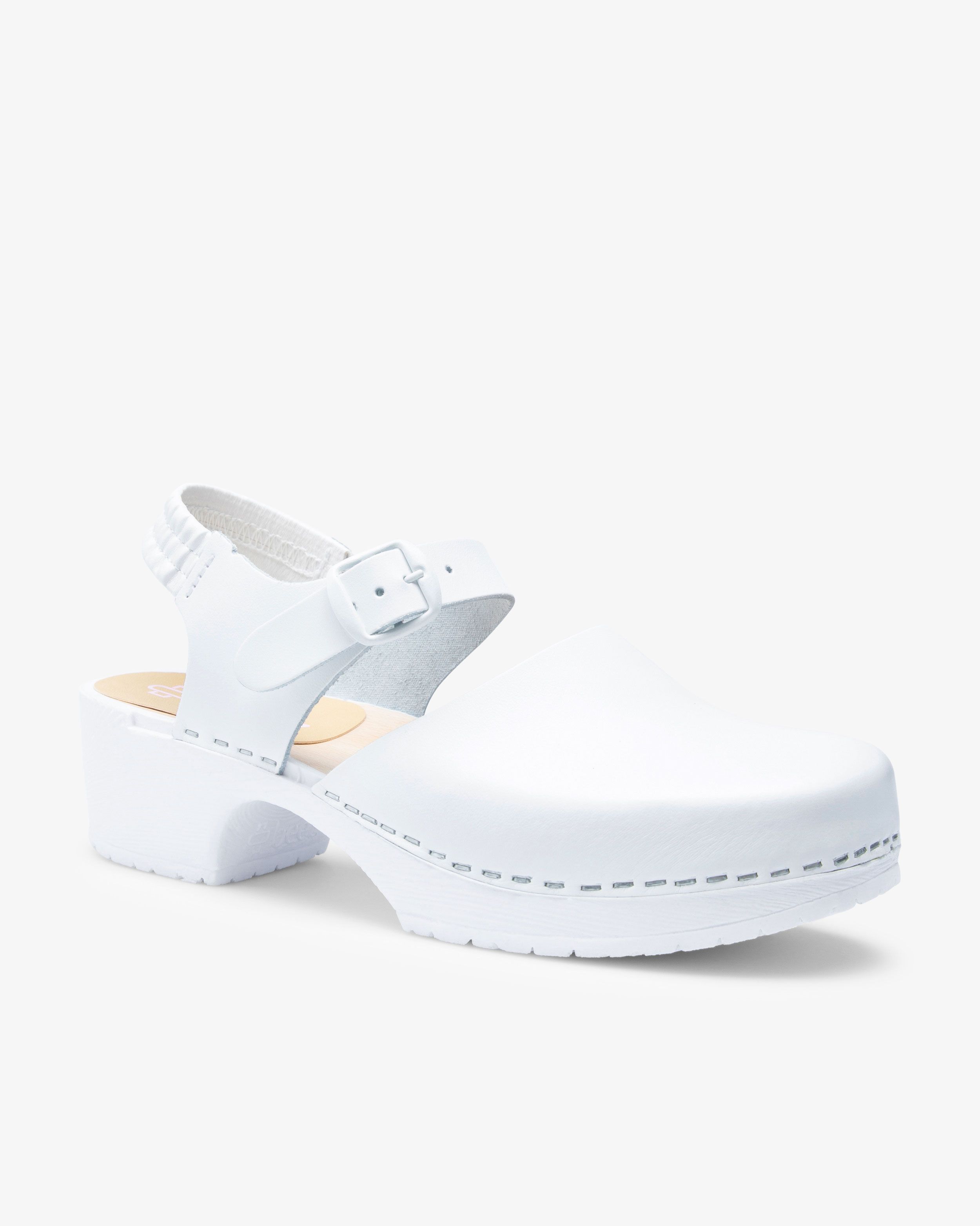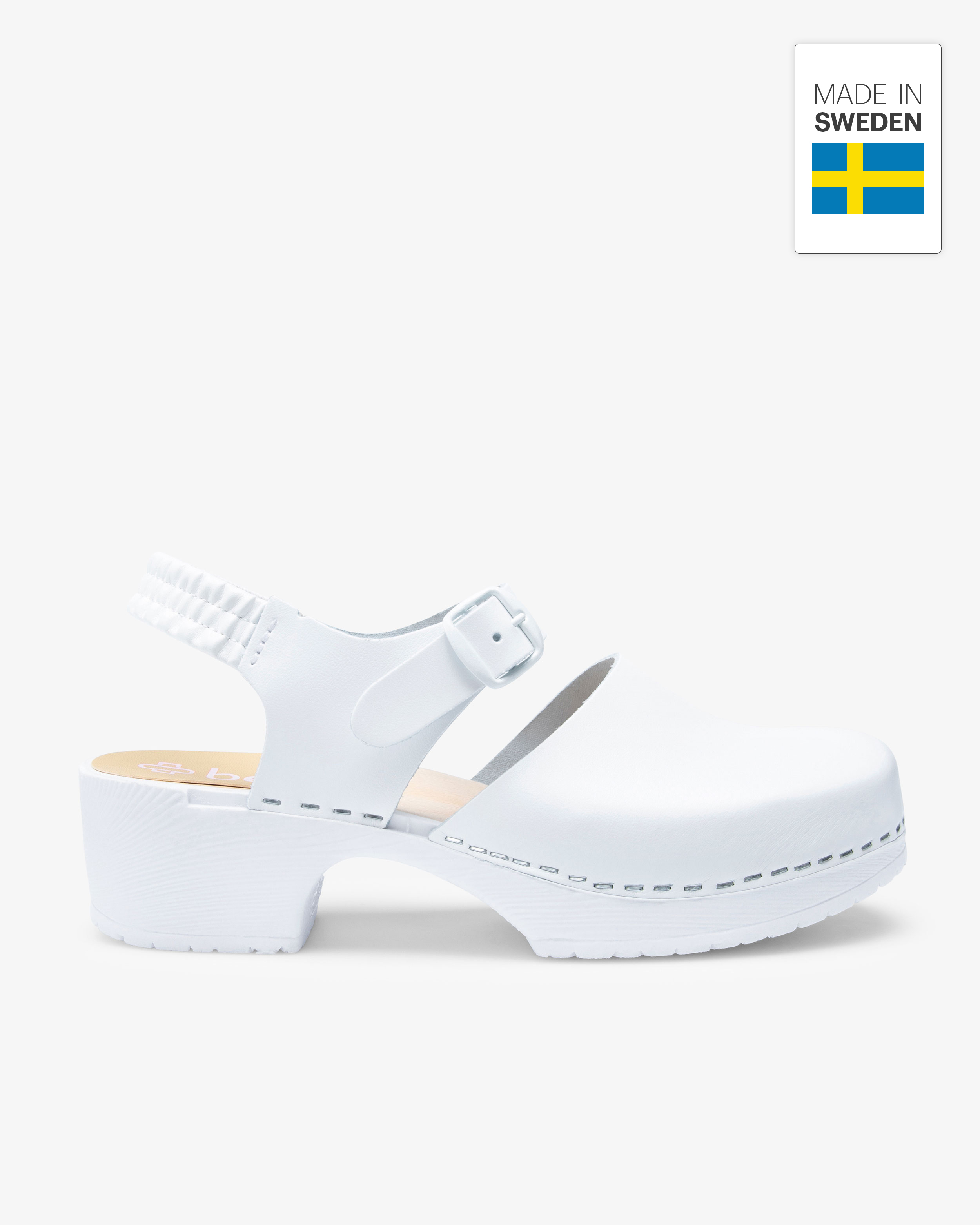 Klassischer Arbeitsschuh im Damenmodell: der Beez Très Chic Clog mit Holzsohle in Weiß. Das moderne Design bietet maximalen Komfort für lange Arbeitstage in der Pflege. Ein Fersenriemen mit Gummizug hält den Fuß sicher im Schuh, während der vordere Riemen verstellbar ist. Die stabile PU-Sohle mit Holzeinlage stützt bequem. Das Obermaterial aus Leder mit PU-Beschichtung ist atmungsaktiv, leicht abwischbar und hat eine harte Zehenkappe.