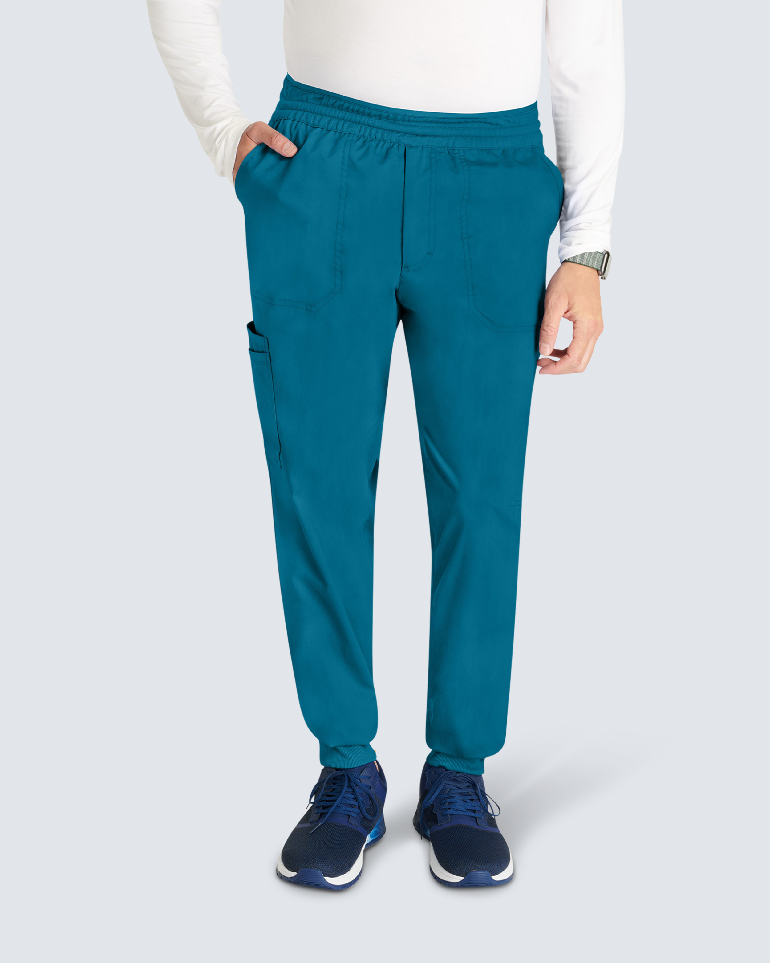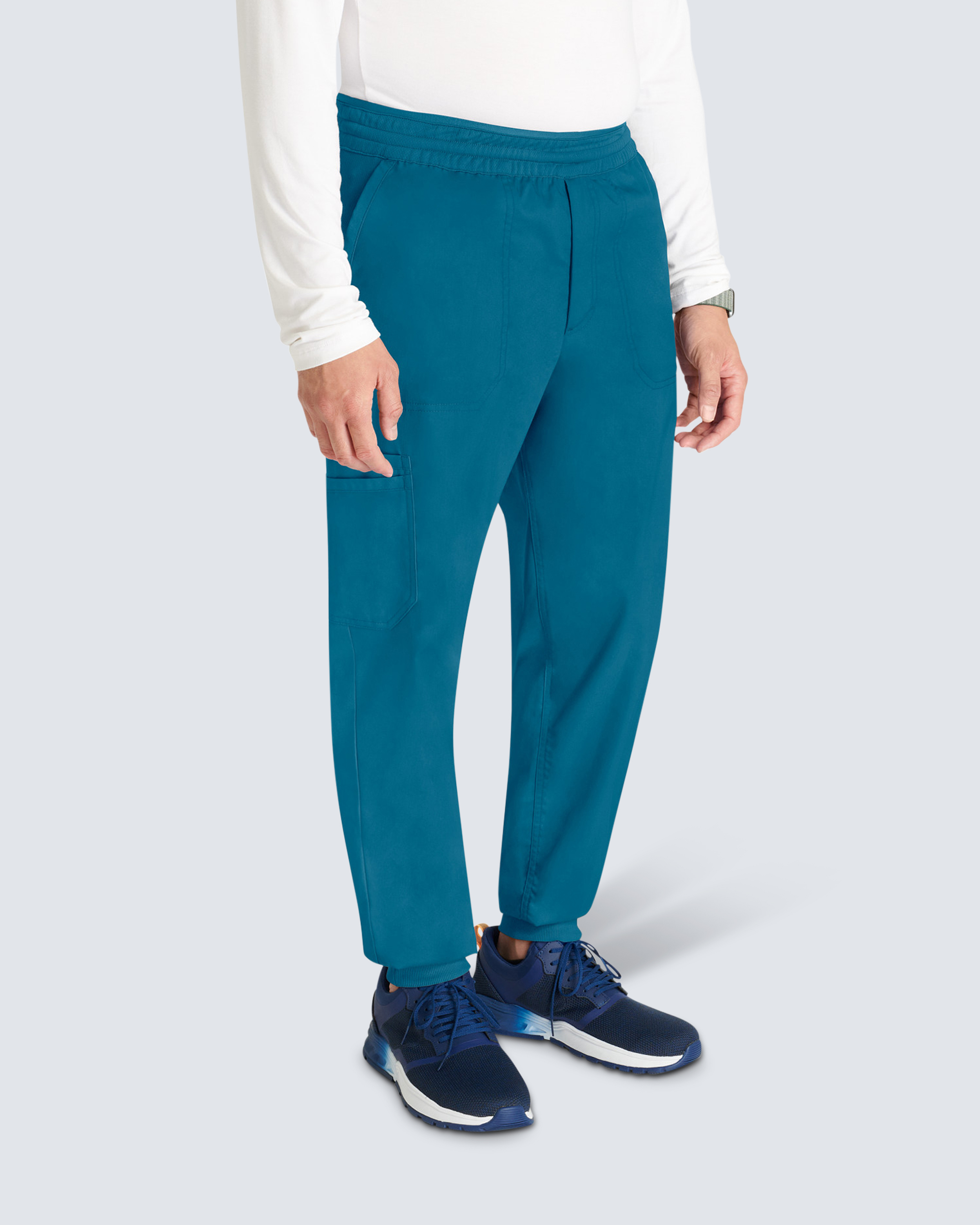 Herrenhose im Jogger-Stil mit Bündchen unten, die Komfort und Funktion kombiniert, perfekt für lange Arbeitstage. Mit moderner Passform und mittelhoher Taille bietet sie einen sportlichen Stil mit Gummizug hinten und Kordelzug für eine flexible Passform. Ihr Pull-on-Design hat smarte Taschenlösungen: schräge Vordertaschen, eine Gesäßtasche, Cargotaschen und eine doppelte Seitentasche. Doppelnähte vorne, hinten und entlang der Nähte sorgen für Haltbarkeit und ein stilvolles Finish.