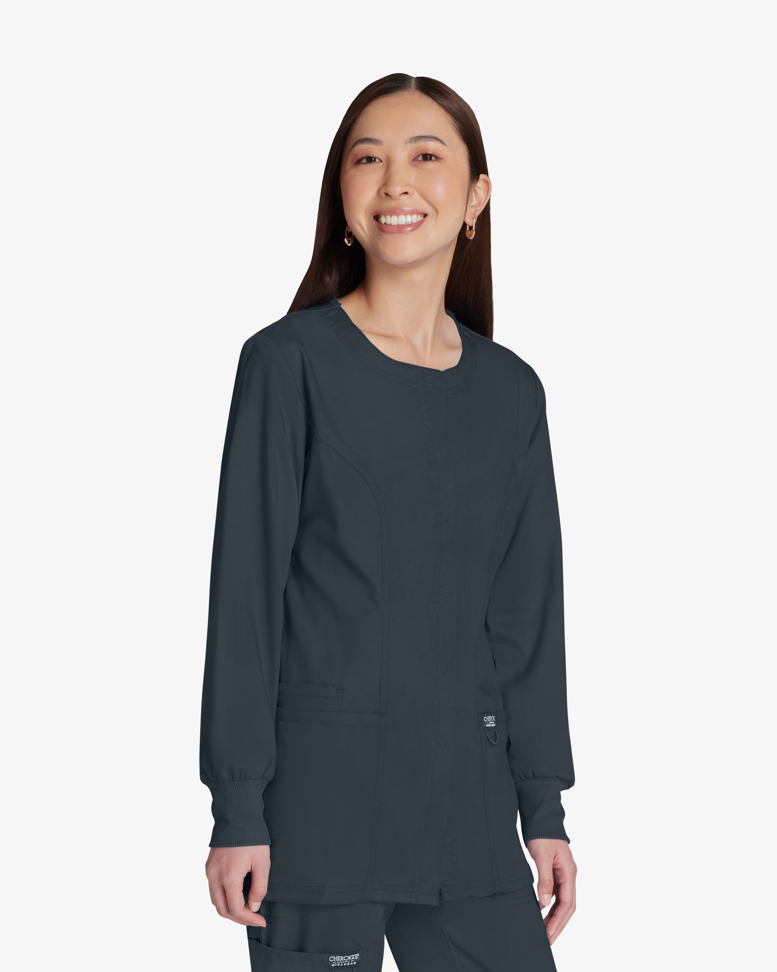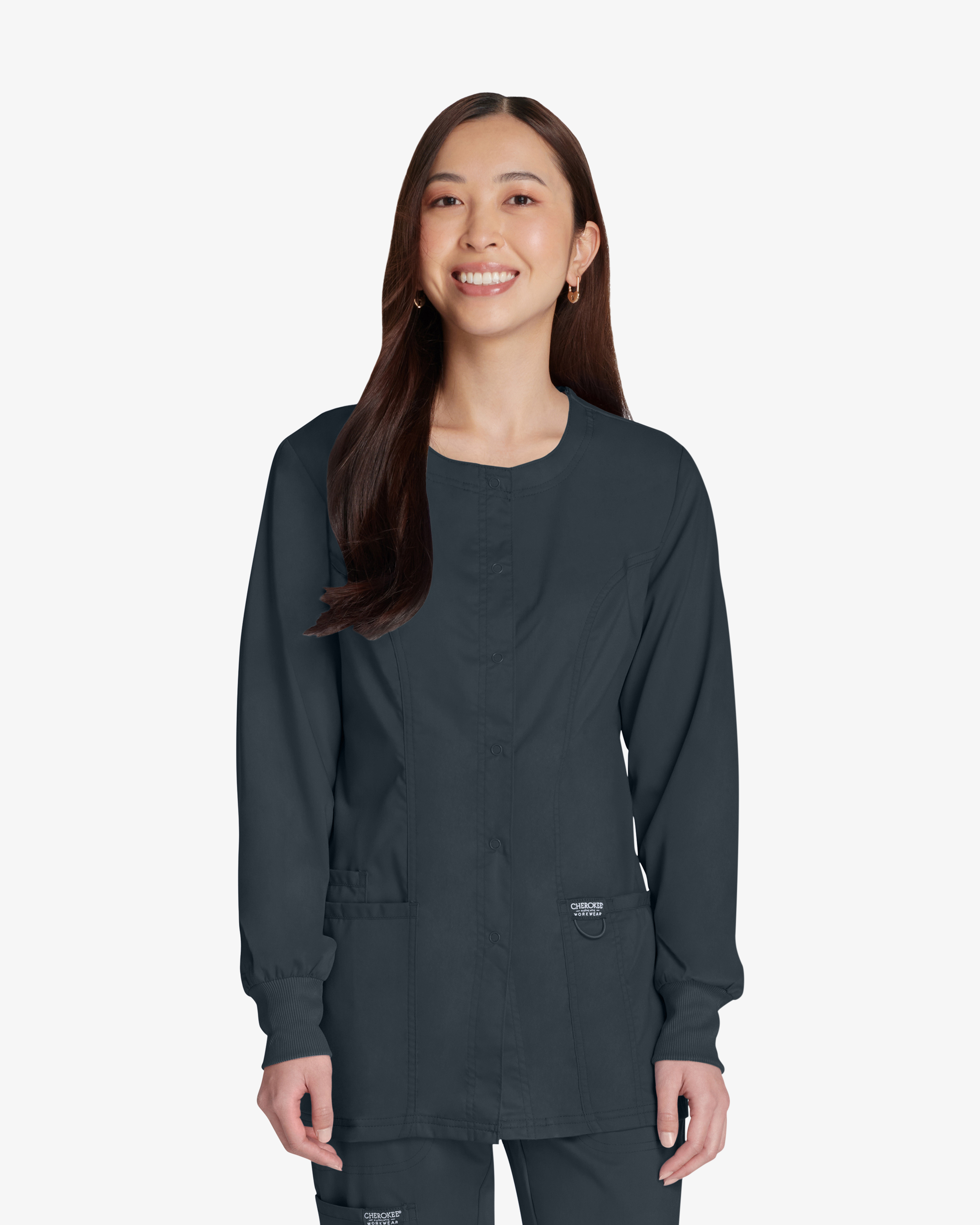 Jacke in moderner klassischer Passform mit Druckknöpfen vorne und 2-Wege-Stretch für optimale Bewegungsfreiheit. Zwei praktische aufgesetzte Taschen, eine mit einer Innentasche und die andere mit einer versteckten Instrumentenschlaufe, sorgen für organisierte Aufbewahrung. Elegantes Design mit Prinzessnähten, Rückenpasse und dezenten Seitenschlitzen. Gerippte Bündchen für ganztägigen Komfort. Rückenlänge 70 cm.