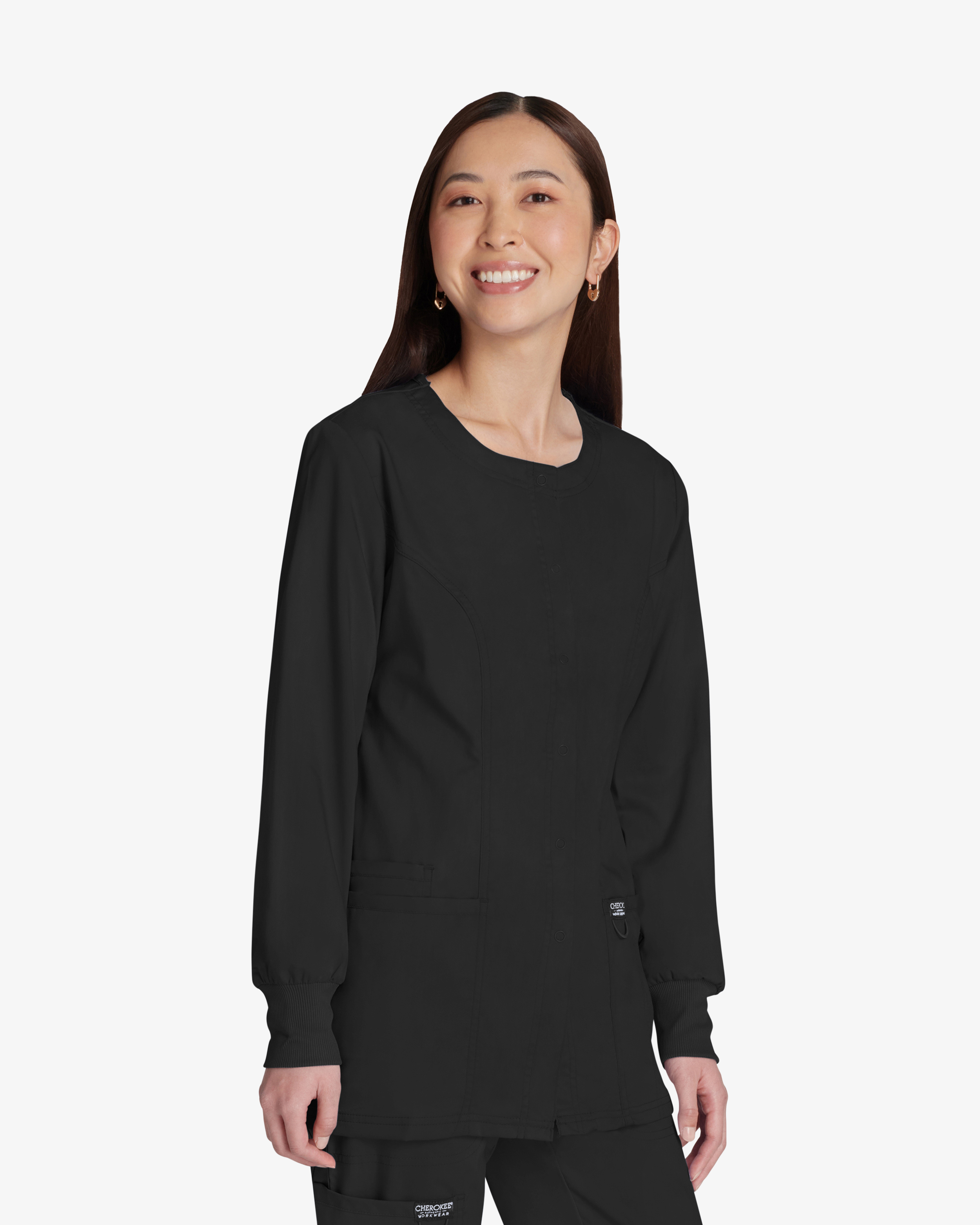 Jacke in moderner klassischer Passform mit Druckknöpfen vorne und 2-Wege-Stretch für optimale Bewegungsfreiheit. Zwei praktische aufgesetzte Taschen, eine mit einer Innentasche und die andere mit einer versteckten Instrumentenschlaufe, sorgen für organisierte Aufbewahrung. Elegantes Design mit Prinzessnähten, Rückenpasse und dezenten Seitenschlitzen. Gerippte Bündchen für ganztägigen Komfort. Rückenlänge 70 cm.