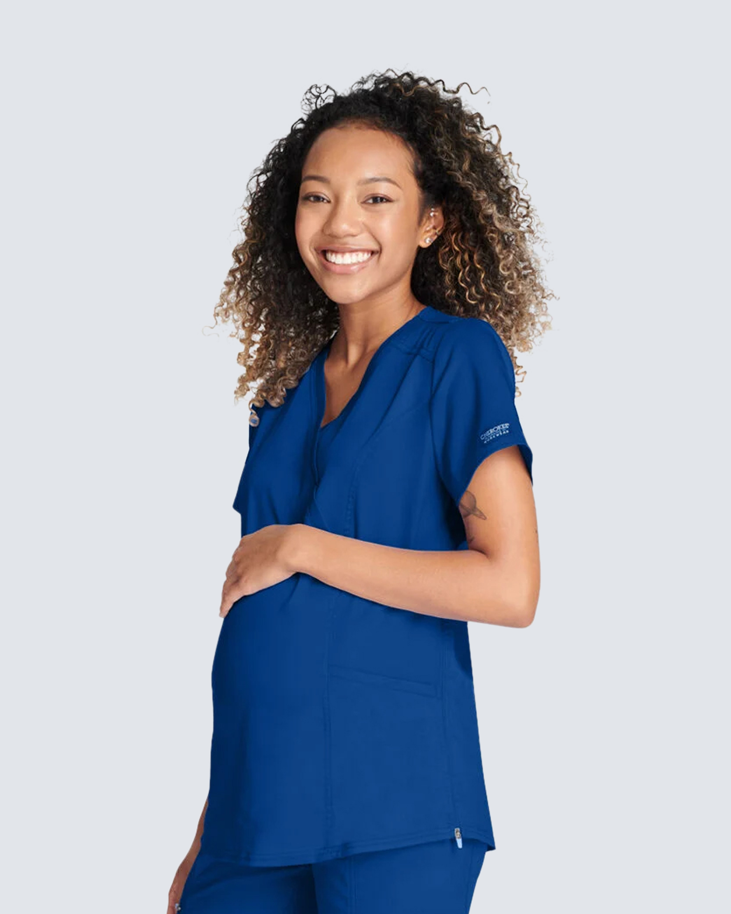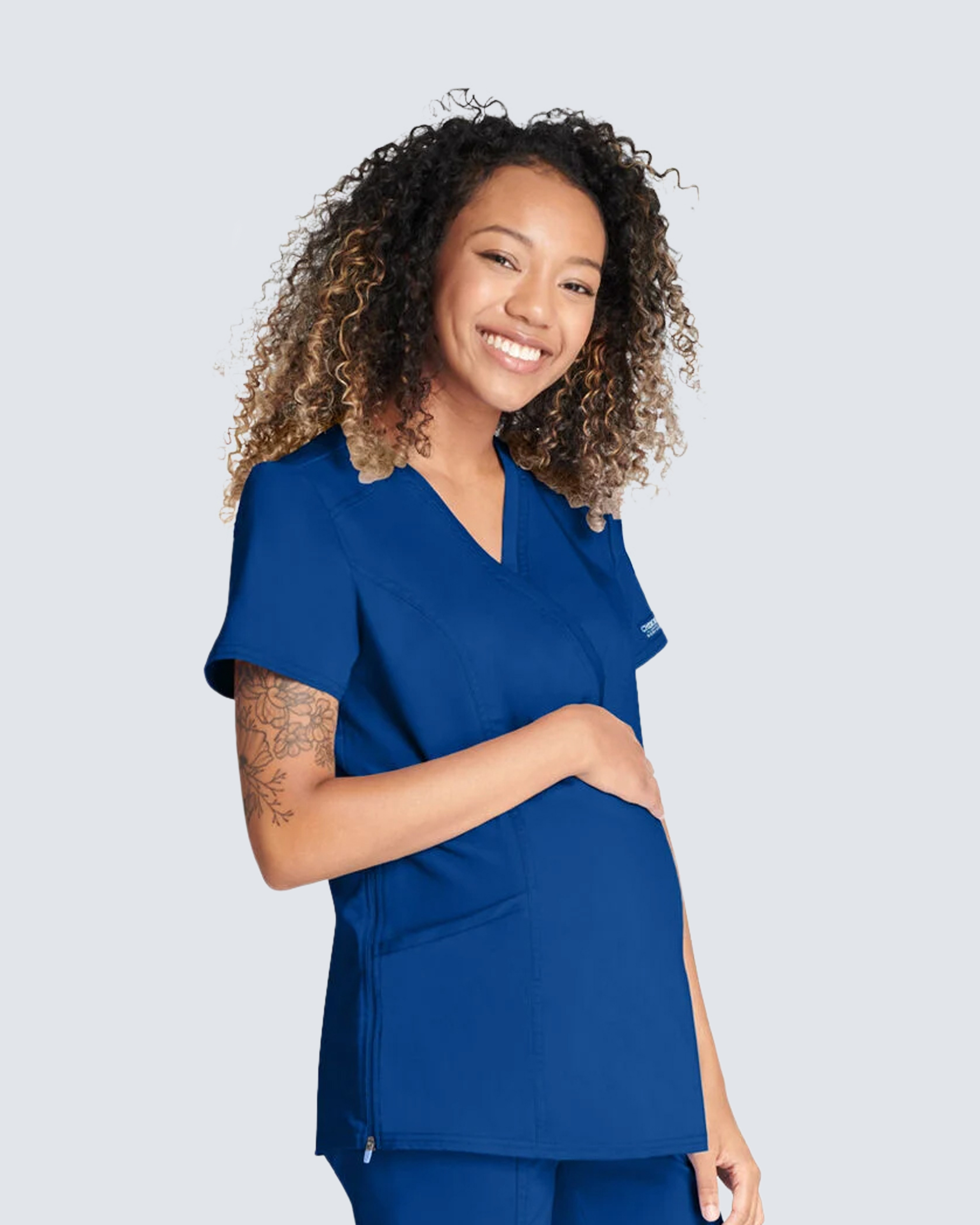 Die Umstandstunika im Wickeldesign ist für Komfort und Funktion während der gesamten Schwangerschaft konzipiert. Das weiche Strickpanel vorne und die seitlichen Keile mit Reißverschluss und Mesh bieten eine flexible Passform und Platz zum Wachsen. Die Tunika hat zwei praktische Vordertaschen und durchdachte Nähte vorne und hinten. Die perfekte Wahl für Sie, die Stil, Bewegungsfreiheit und Funktion im Pflegeumfeld kombinieren möchten.