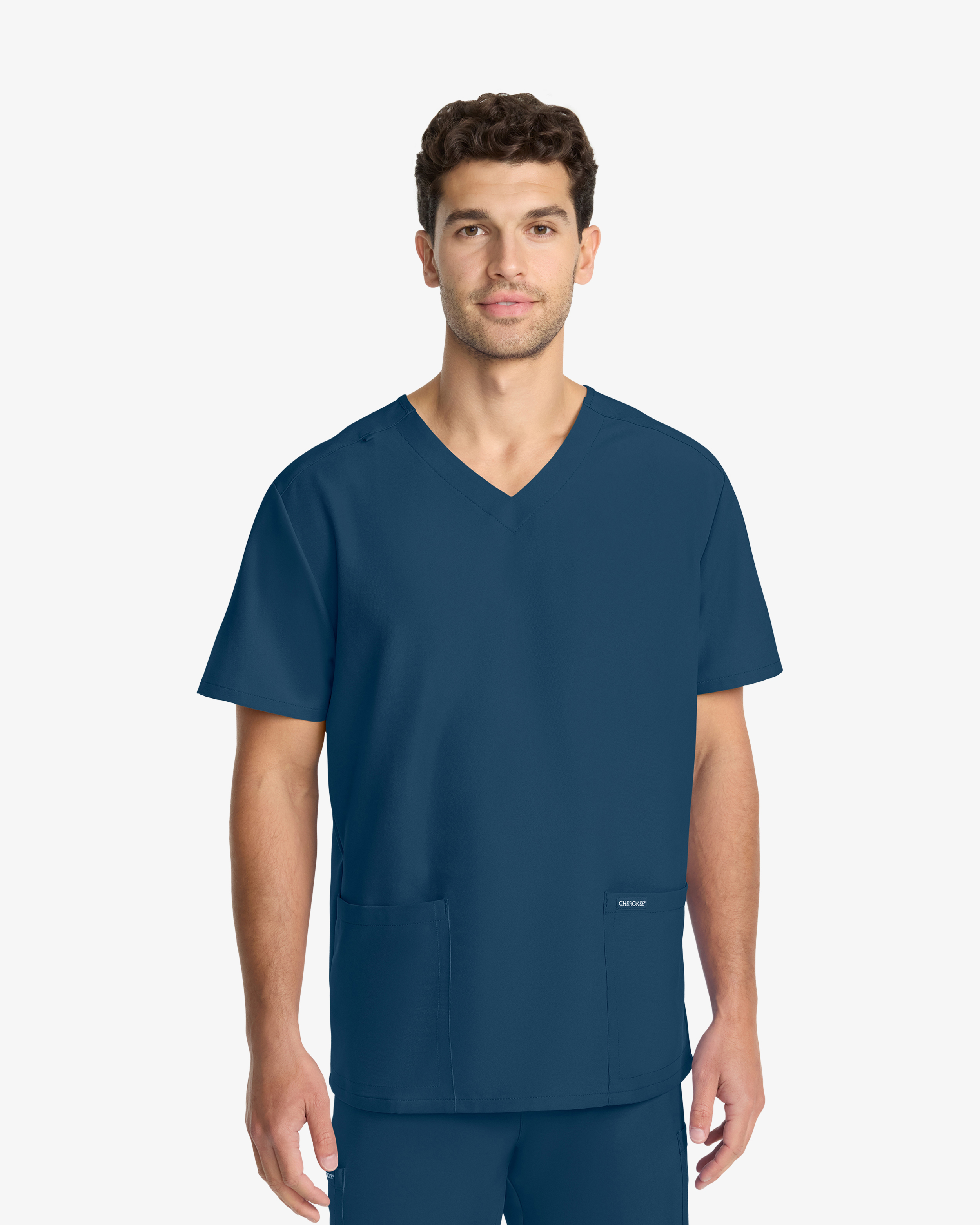 - V-Ausschnitt und farblich abgestimmte Ziernähte