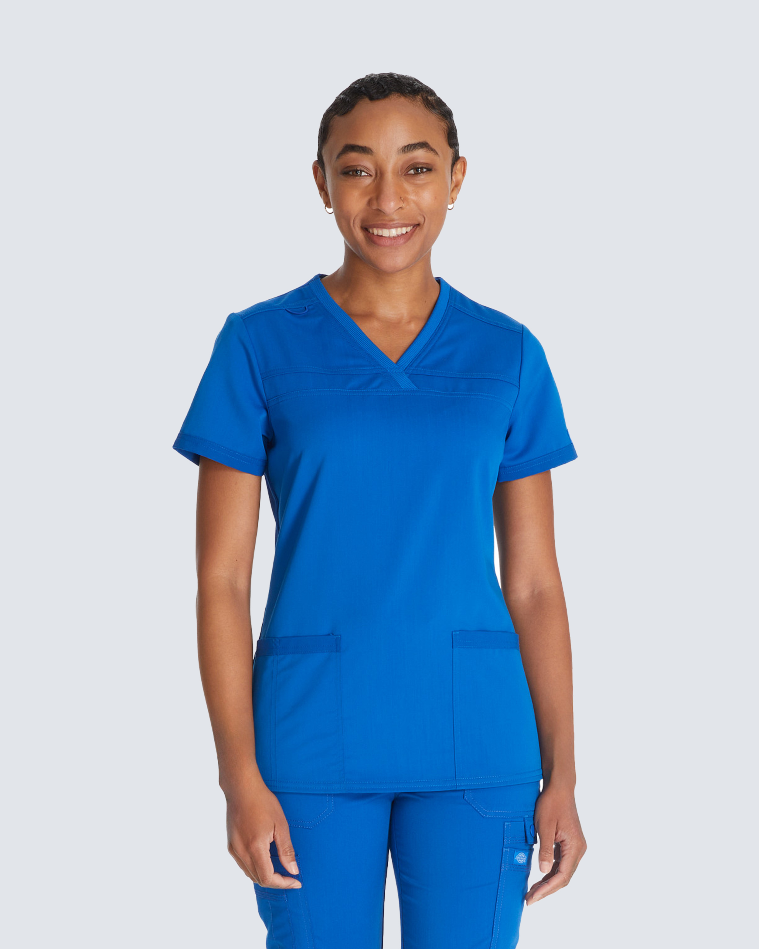 Für lange Arbeitstage konzipiert, bietet diese Damentunika ultimativen Komfort und Stil. Sie hat einen weichen Rippstrick-V-Ausschnitt und rippgestrickte Seiteneinsätze für mehr Bewegungsfreiheit. Die leicht taillierte Passform und zwei aufgesetzte Taschen für wichtige Utensilien machen sie perfekt für Pflegepersonal, das Stil und Komfort schätzt.