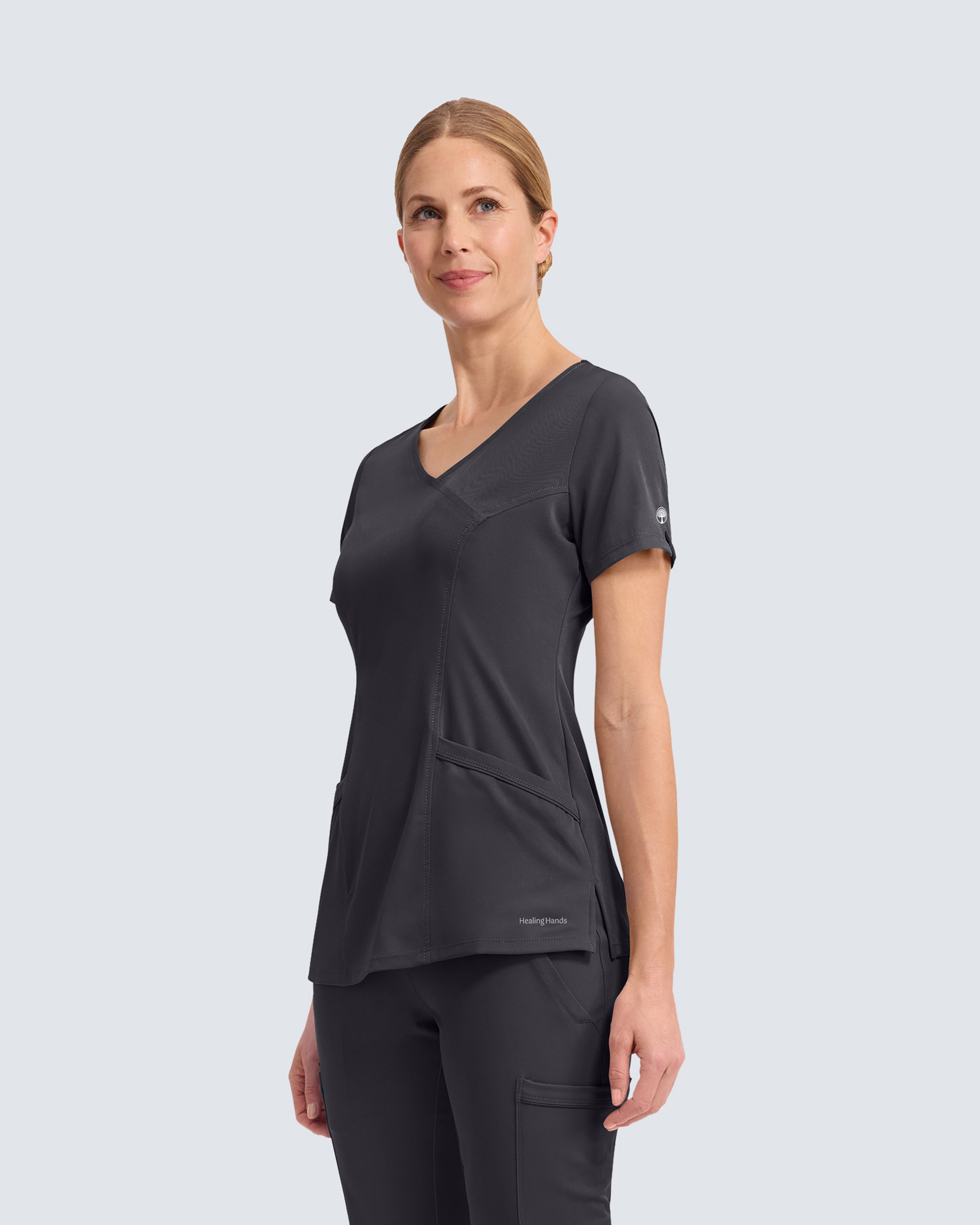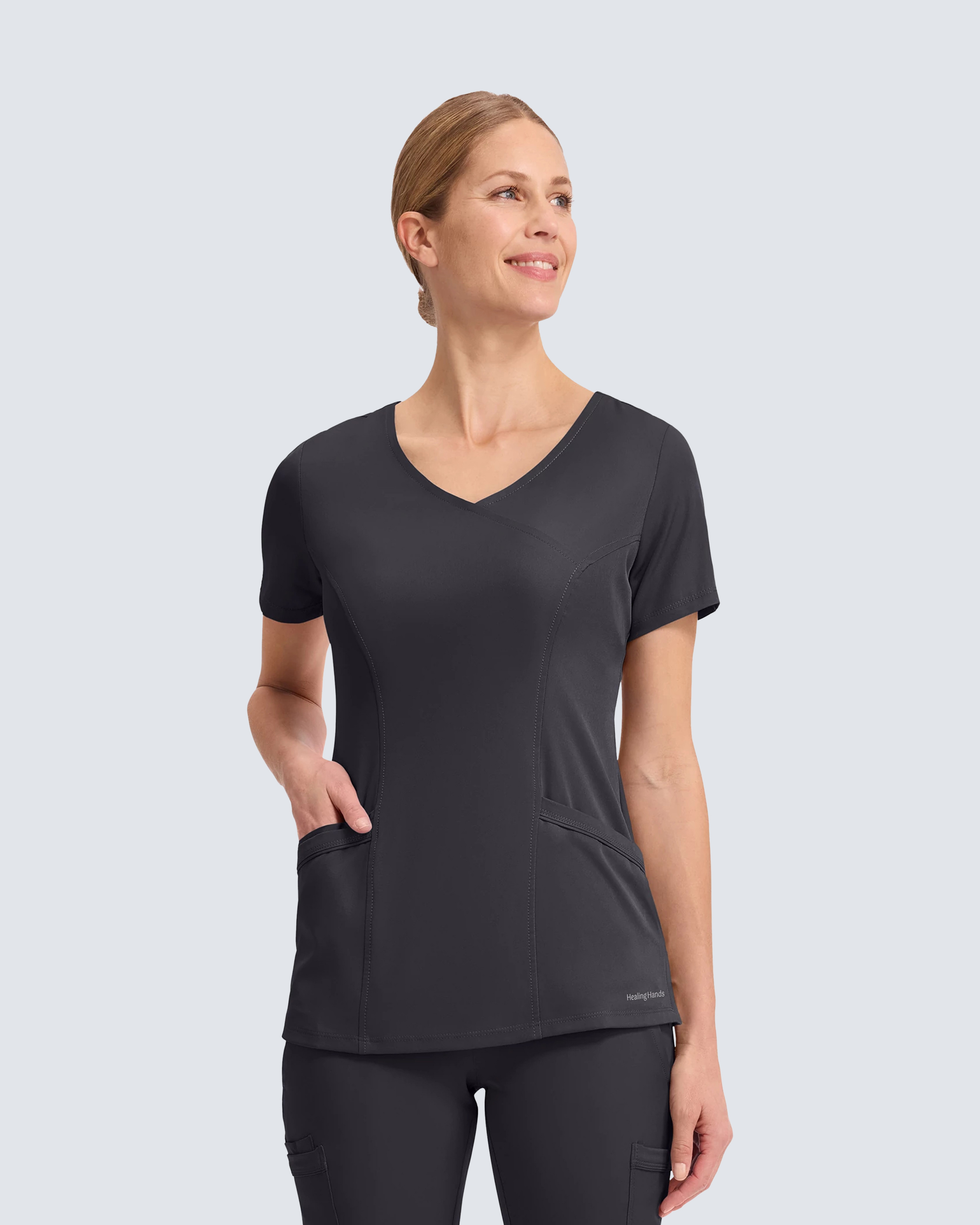 Das Madison-Top von Healing Hands ist so konzipiert, dass es den ganzen Arbeitstag über ein angenehmes und professionelles Tragegefühl bietet. Das Modell hat ein modernes Mock-Wrap-Design und Prinzessnähte vorne und hinten, die eine klare, körpernahe Passform schaffen. Es besteht aus 91% Polyester und 9% Spandex, was das Top flexibel macht und Ihnen die Bewegungsfreiheit gibt, die Sie in einem aktiven Beruf brauchen.