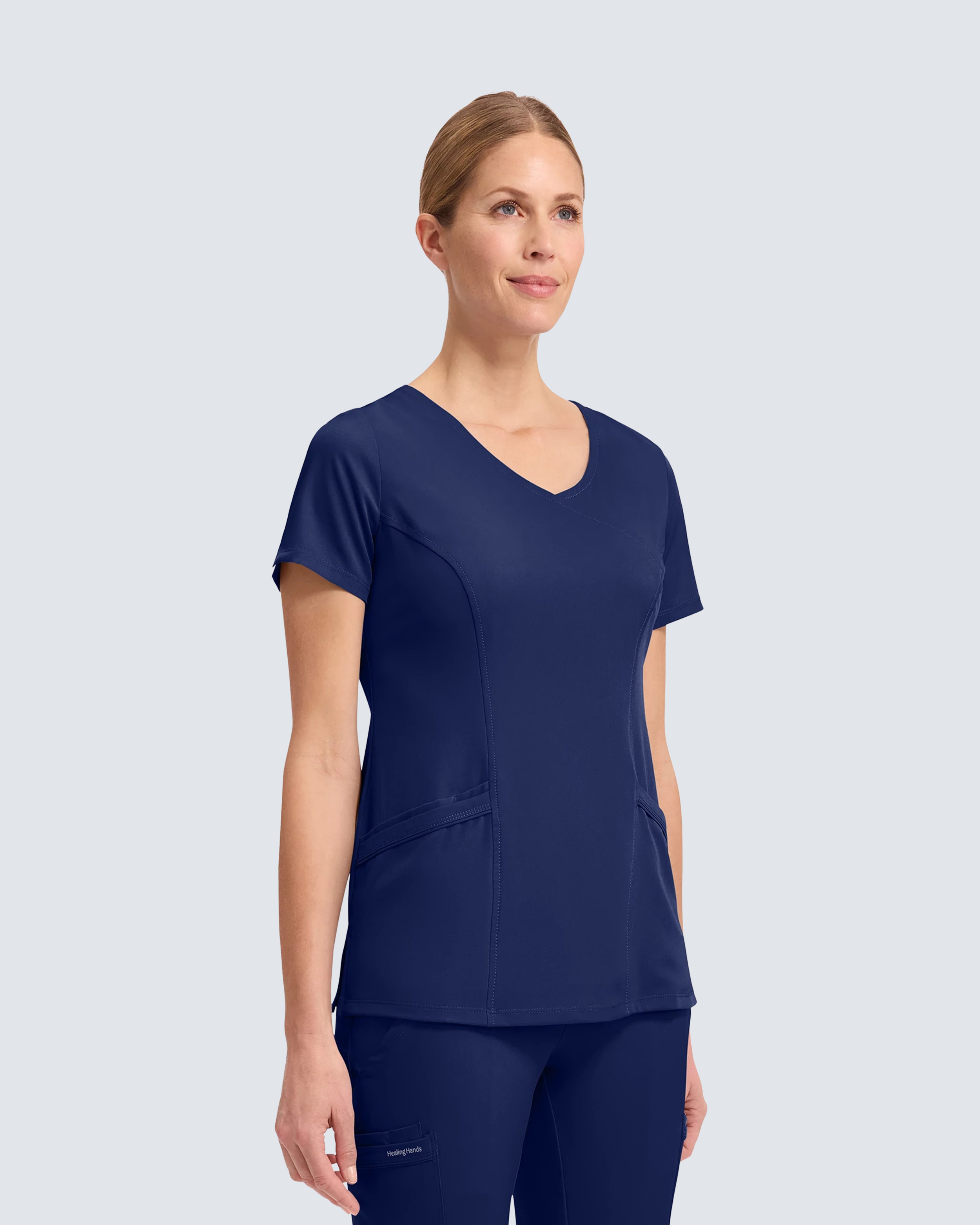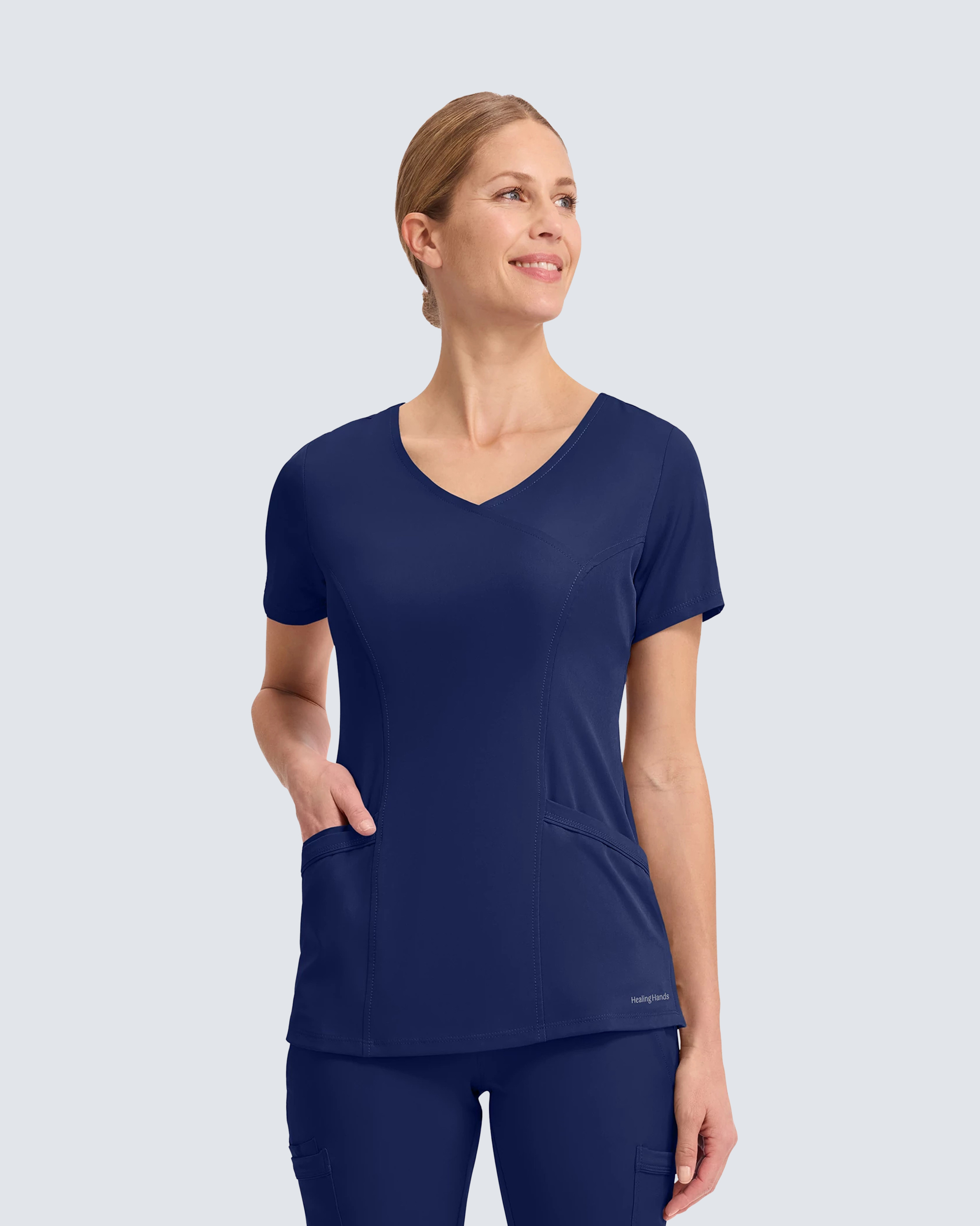 Das Madison-Top von Healing Hands wurde entwickelt, um den ganzen Arbeitstag über ein bequemes und professionelles Gefühl zu vermitteln. Das Modell hat ein modernes Wickel-Design (Mock-Wrap) und ist vorne und hinten mit Prinzessnähten versehen, was eine klare und figurnahe Passform schafft. Das Material besteht aus 91% Polyester und 9% Spandex, wodurch das Top anschmiegsam ist und Ihnen die Bewegungsfreiheit gibt, die Sie in einem aktiven Beruf benötigen.