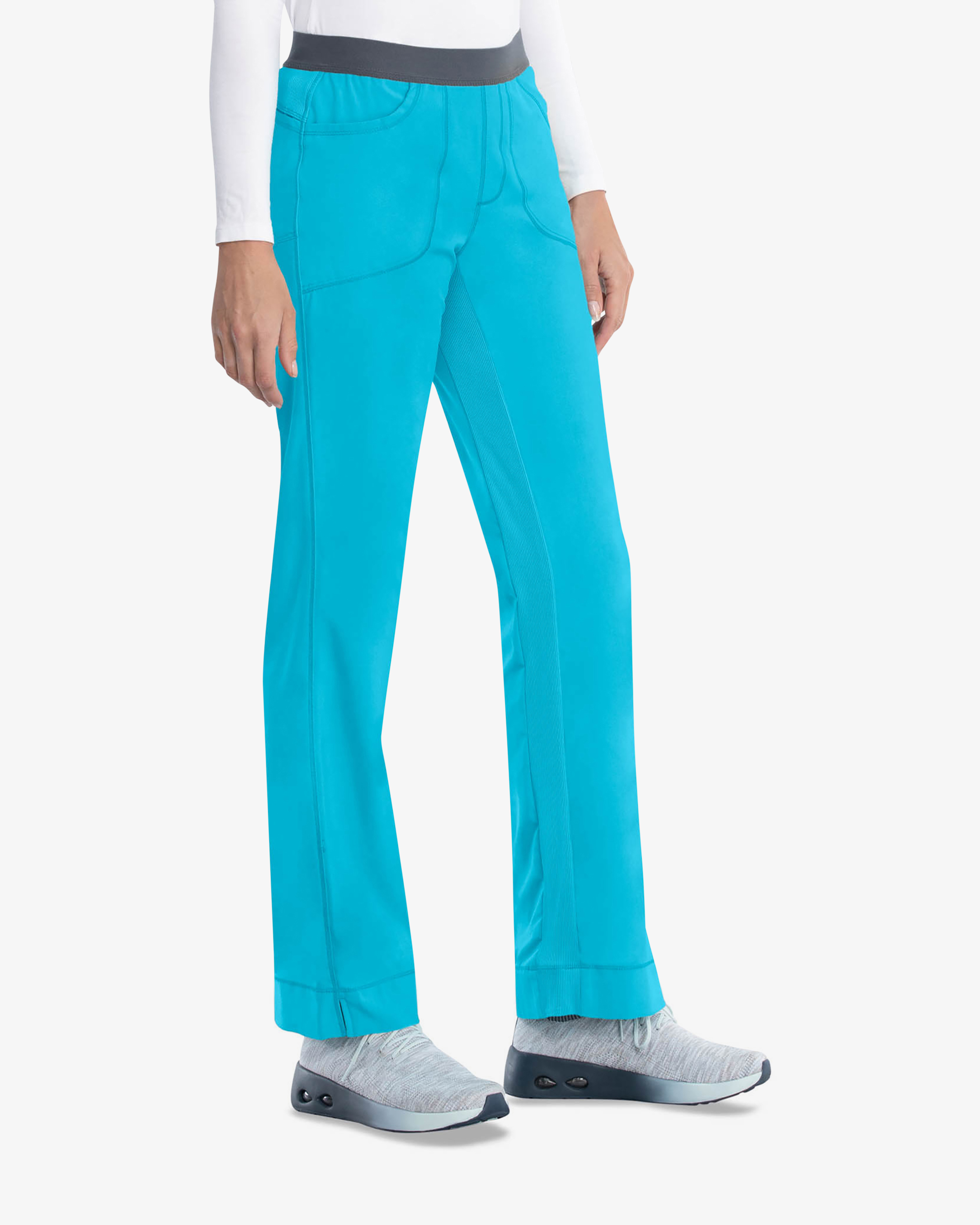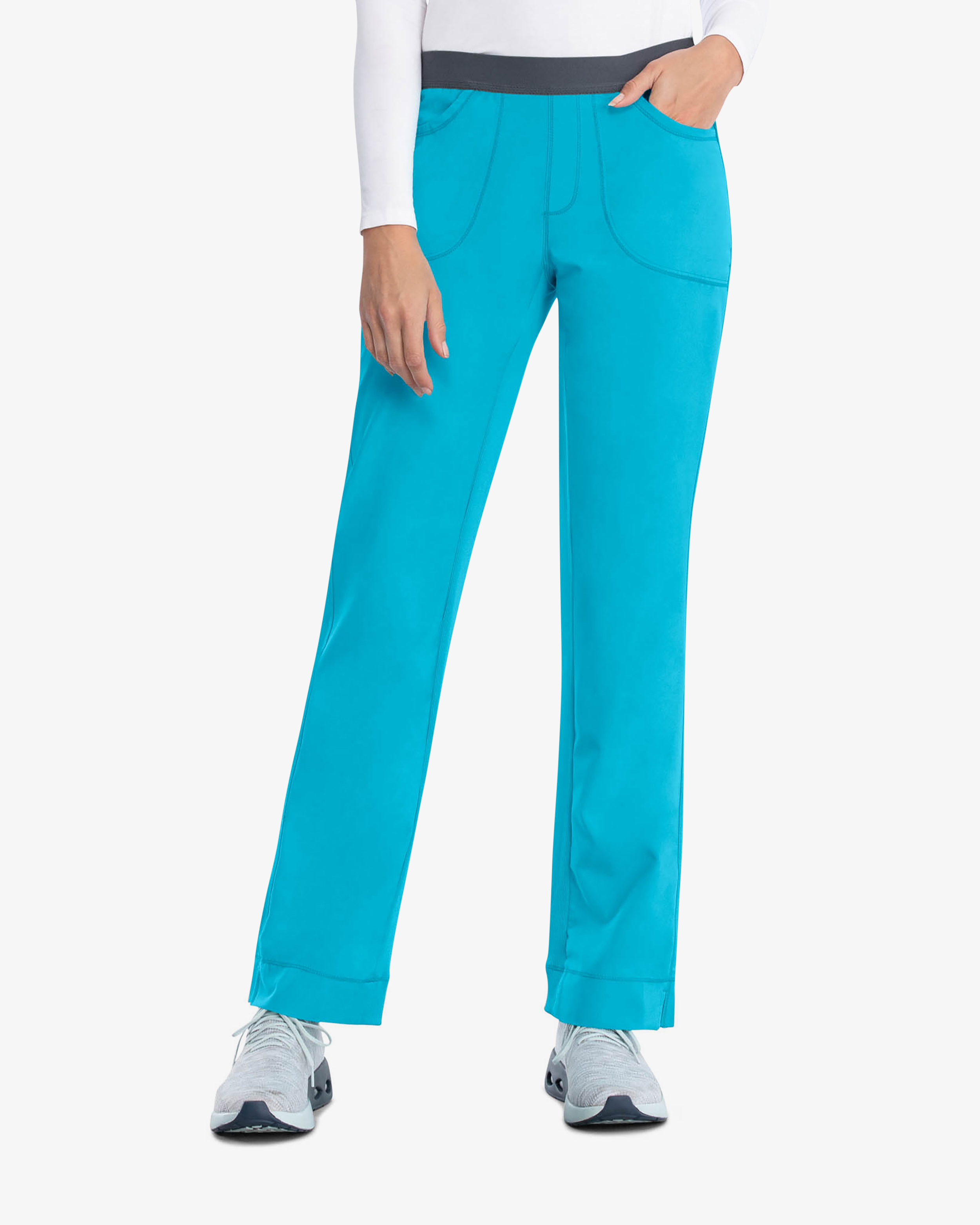 Die Infinity Pull-on Slim Arbeitshose in Aqua bietet eine modische, schmale Passform mit niedrigerer Taille. Für optimalen Komfort sorgt ein weicher Gummibund. Gestrickte Stretcheinsätze an der Beininnenseite machen die Hose extrem bequem. Das 4-Wege-Stretch-Material garantiert Flexibilität und ist feuchtigkeitsableitend. Perfekt, um Funktion und Stil zu vereinen.