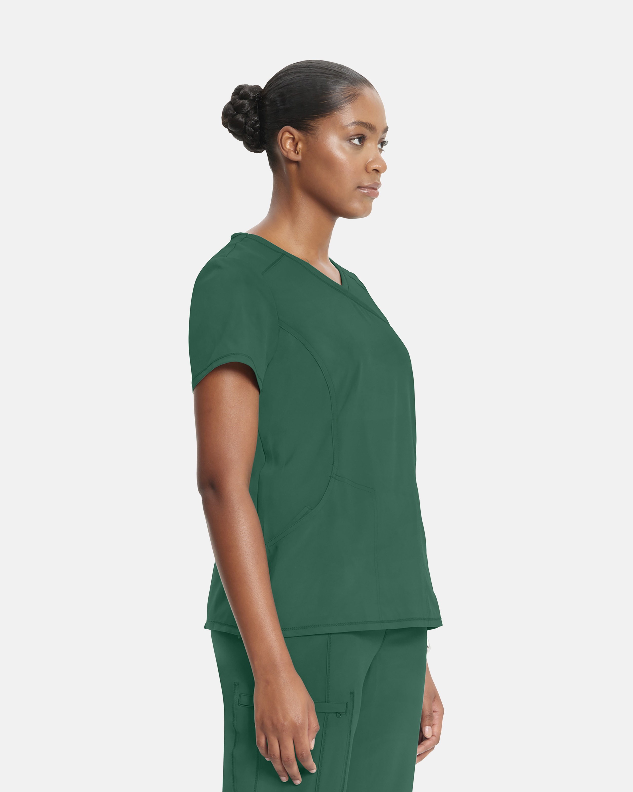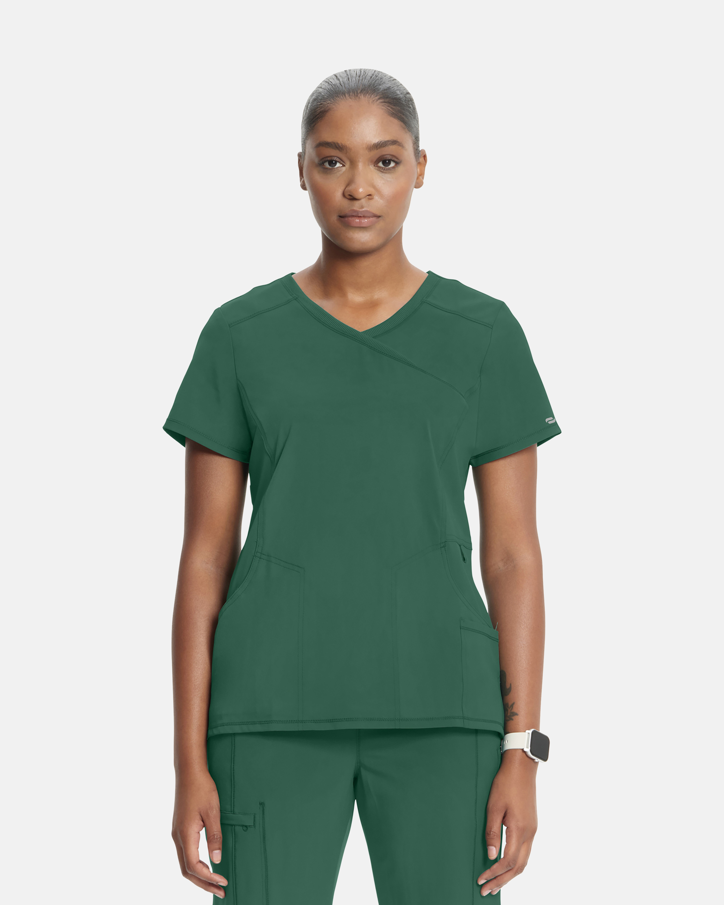 Dieses moderne Wickeloberteil in Dunkelgrün bietet dank seiner taillierten Passform und den Stretch-Rippdetails ganztägigen Komfort. Der 4-Wege-Stretch sorgt für maximale Bewegungsfreiheit. Praktische Details wie ein O-Ring und eine Scherentasche halten Ihre Utensilien griffbereit. Das Material ist feuchtigkeitsableitend und knitterfrei.