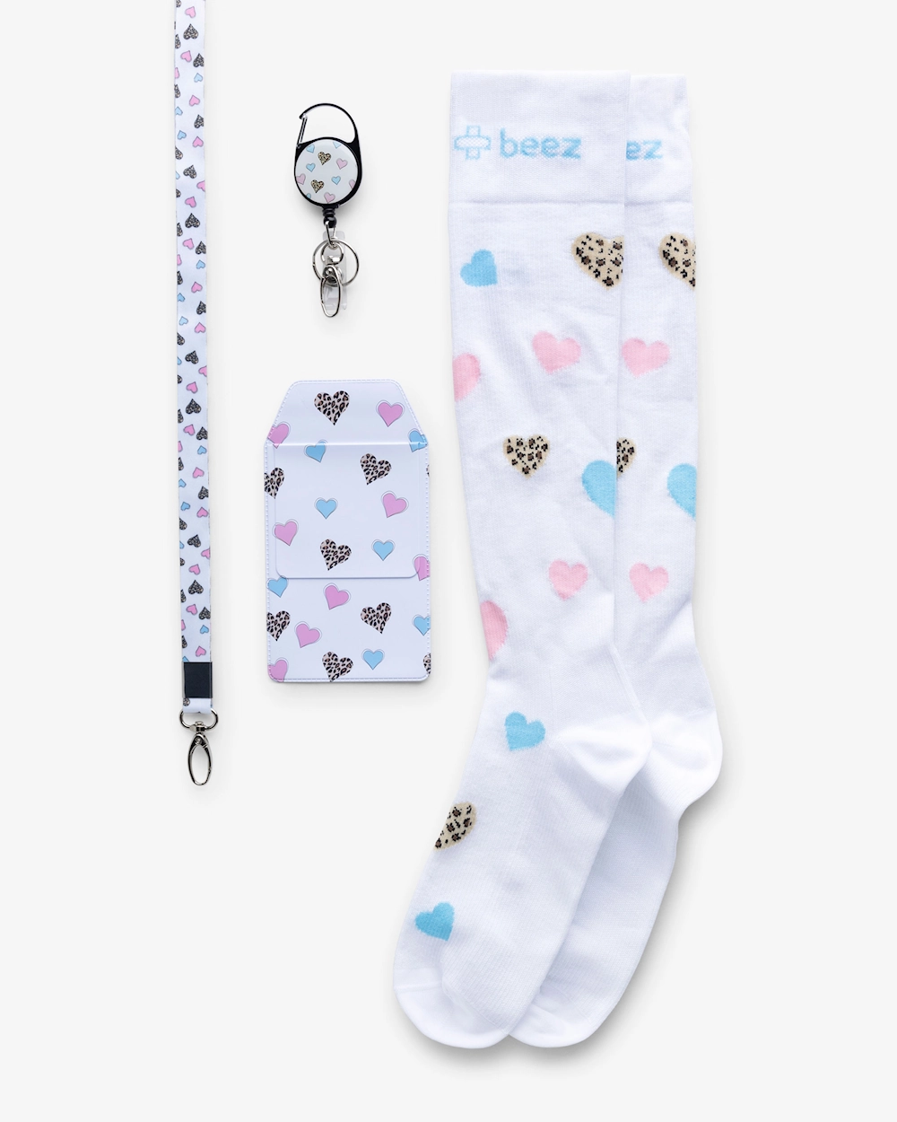 Wer sagt, dass Arbeitskleidung langweilig sein muss? Mit dem Stützstrumpf-Set Herzen erhalten Sie eine Auswahl an Hilfsmitteln, die nicht nur Ihre Arbeit erleichtern, sondern auch als Gesprächseinstieg mit Patienten dienen. Die Stützstrümpfe bieten medizinische graduierte Kompression, was für Sie entscheidend ist, wenn Sie viel stehen und gehen, da es dem Herzen hilft, das Blut aus den Beinen zurückzupumpen.