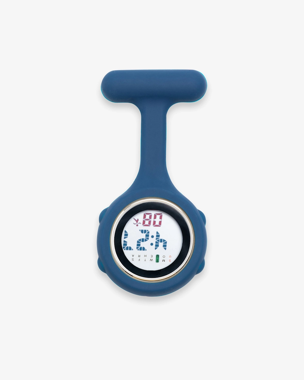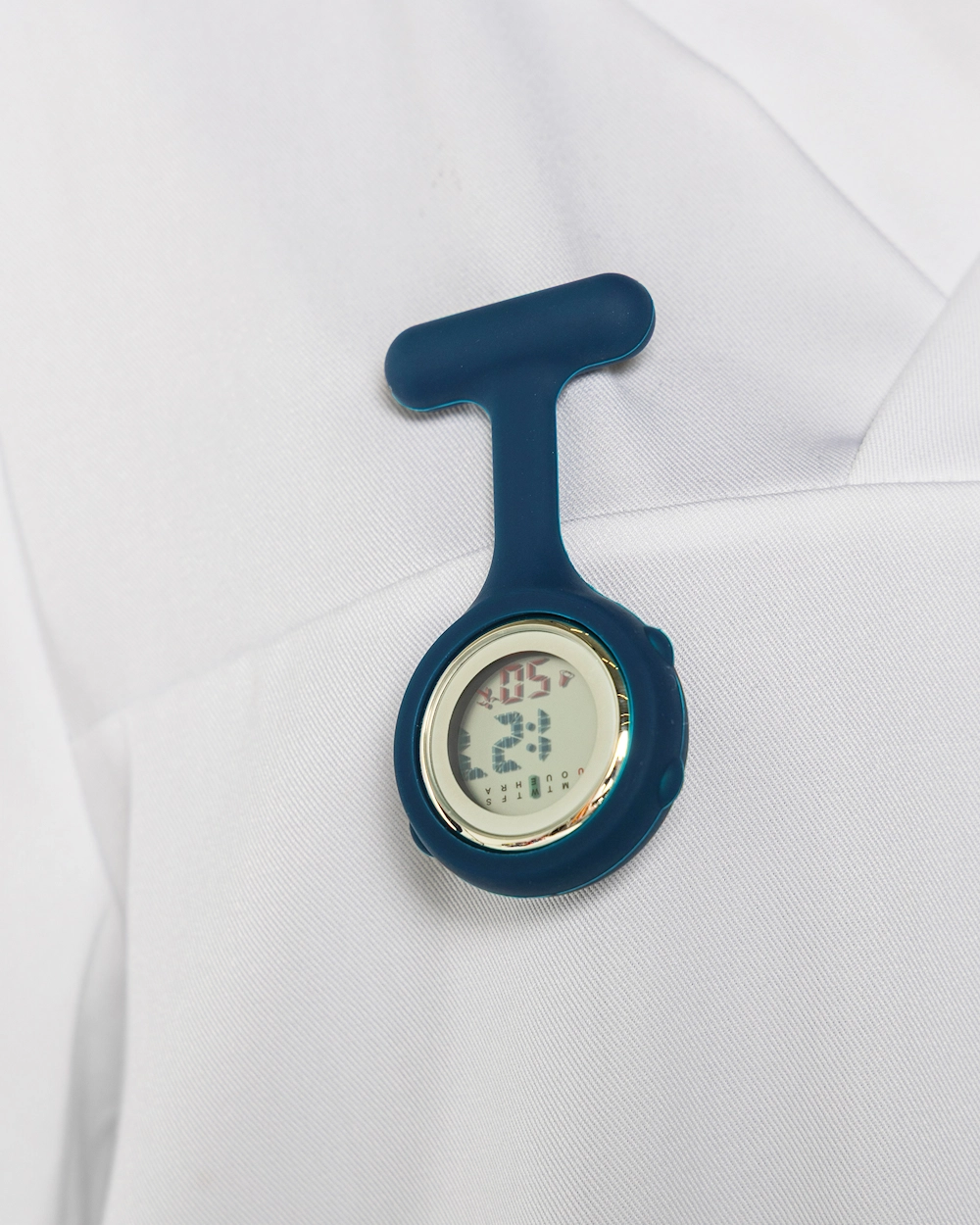 Schwesternuhr mit Silikonhülle, die Sie einfach abnehmen können, um sie zu reinigen oder die Farbe der Hülle zu wechseln. Die Uhr verfügt über eine digitale Zeitanzeige und praktische Funktionen wie Datum, Wochentagsanzeige, 12/24-Stunden-Anzeige, Alarm und Stoppuhr. Die Uhr befestigen Sie einfach mit der Sicherheitsnadel auf der Rückseite an Ihrer Arbeitskleidung.